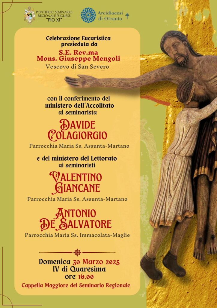 Domenica prossima, presso la Cappella del Seminario Regionale di Molfetta, alcuni seminaristi della nostra Diocesi saranno istituti lettori e accoliti.