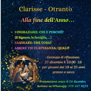 Il 27 dicembre la Fraternità delle Clarisse di Otranto organizza presso il Monastero una giornata di ritiro per giovani, per riflettere sul cammino dell’anno trascorso e per aprire nuove piste alla luce del Vangelo per l’Anno 2026.