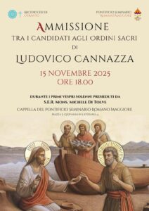 Sabato 15 novembre, il seminarista della nostra diocesi Ludovico Cannazza, originario della parrocchia ‘Maria Ss. ma Annunziata’ in Castignano dè Greci, sarà ammesso tra i candidati e agli ordini sacri del diaconato e del presbiterato durante la celebrazione dei Primi Vespri presieduti da S. E. Rev. ma Mons. Michele Di Tolve, Vescovo ausiliare di Roma e Rettore del Pontificio Seminario Romano Maggiore.
