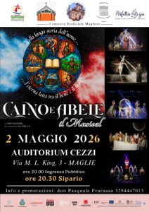 “Nella lunga storia dell’uomo… l’eterna lotta tra il bene e il male” prende vita sul palco con CAINO E ABELE, un Musical che avrà luogo il 2 maggio presso l’Auditorium Cezzi a Maglie alle ore 20.30 (ingresso al pubblico ore 20.00).