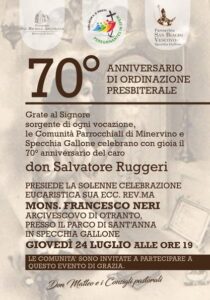 Don Salvatore Ruggeri, già parroco di Specchia Gallone, celebra settant’anni anni di ordinazione presbiterale.