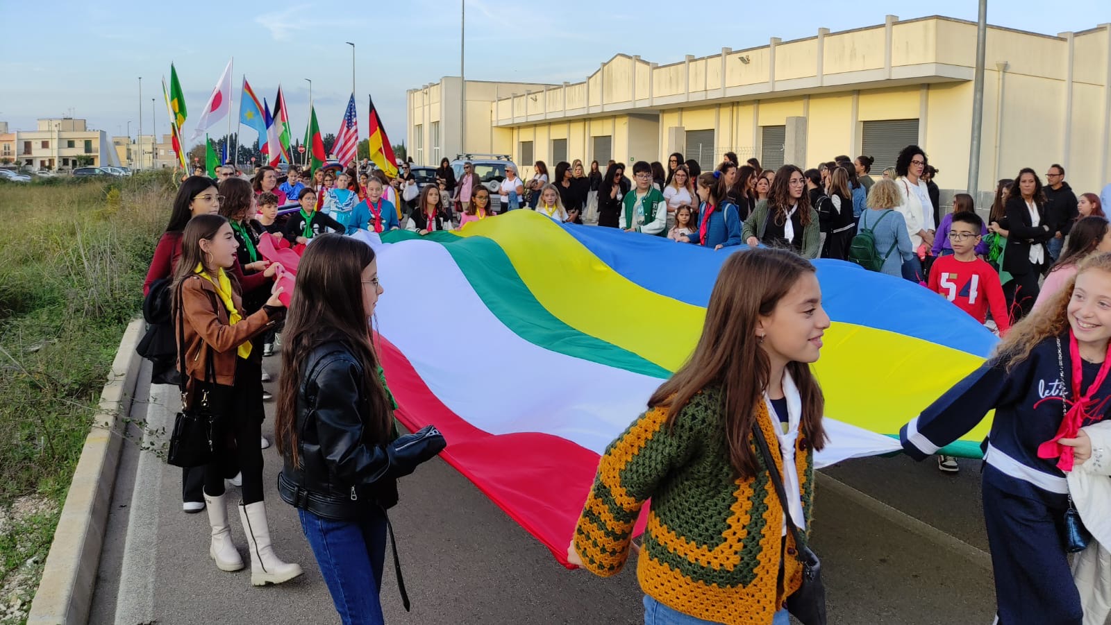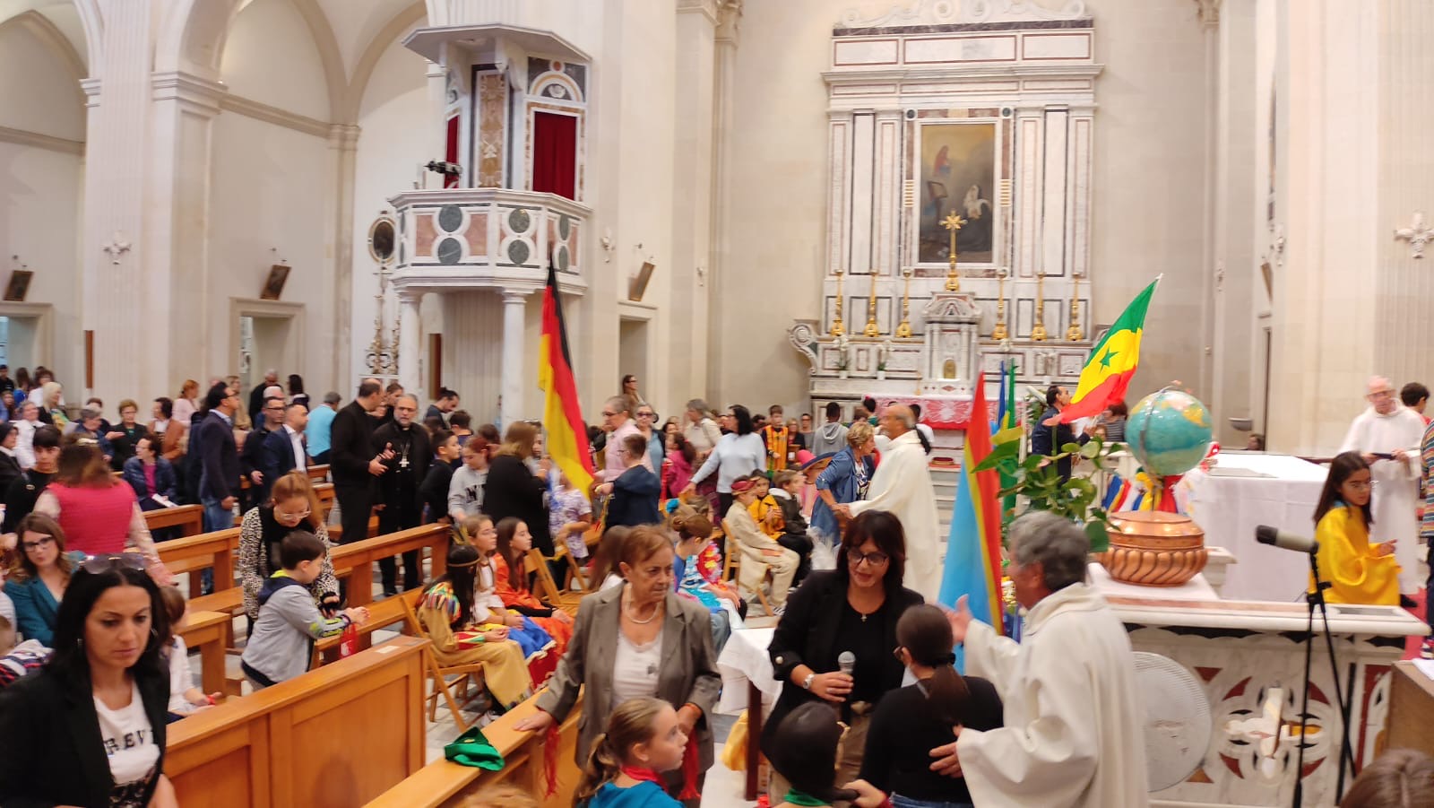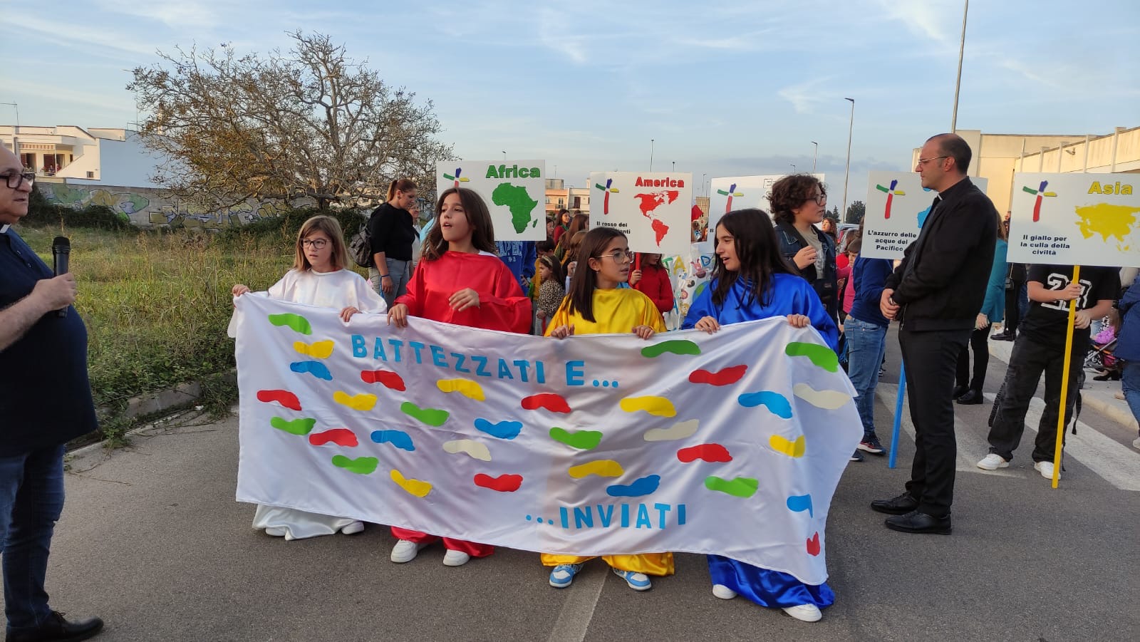 Per testimoniare la gioia del Vangelo alcuni ragazzi e ragazze hanno indossato gli abiti tradizionali dei vari continenti. Sventolando bandiere e striscioni, con slogan relativi al tema della giornata missionaria, in corteo dall’oratorio, si sono diretti in chiesa percorrendo alcune strade del paese e allietando il tutto con canti e musica.