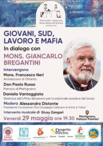 Venerdì 29 maggio, anziché in aprile come precedentemente programmato, alle ore 19.30, presso la sala di Palazzo Palmieri in Martignano, si terrà l’incontro con mons. Giancarlo Bregantini, arcivescovo emerito di Campobasso-Boiano, dal titolo “Giovani, Sud, lavoro e mafia”. Un dialogo a più voci aperto a tutte e tutti, per riflettere su temi di sempre scottante attualità sociale ed ecclesiale.