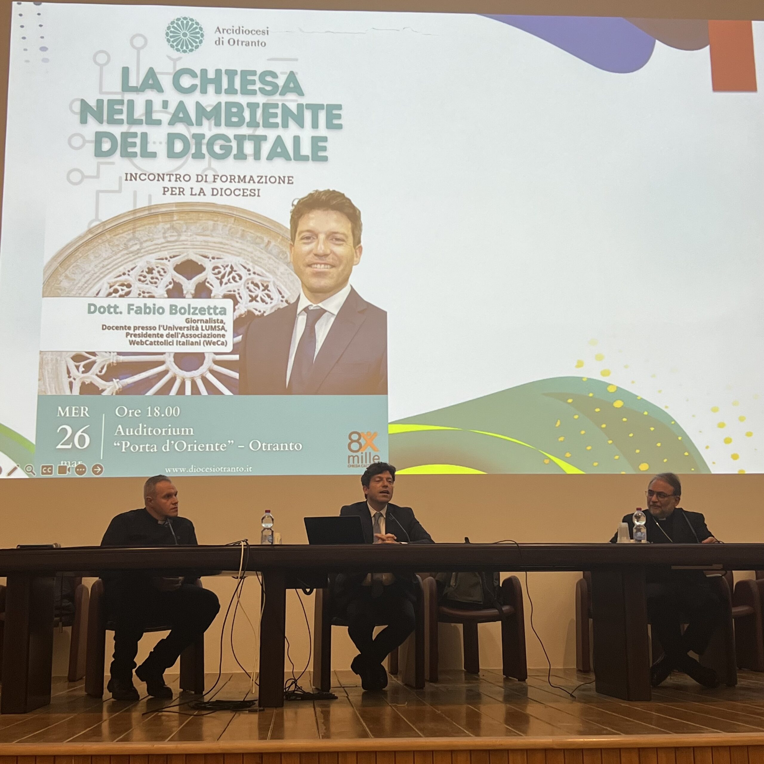 Nel pomeriggio del 26 marzo, presso l’Auditorium Porta d’Oriente di Otranto, si è tenuto l’incontro “La Chiesa nell’ambiente del digitale” con il Dott. Fabio Bolzetta, giornalista, inviato e conduttore del TG di TV2000, docente dell’Università LUMSA, e Presidente dell’associazione WebCattolici Italiani (WeCa).