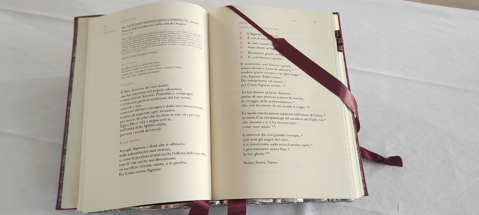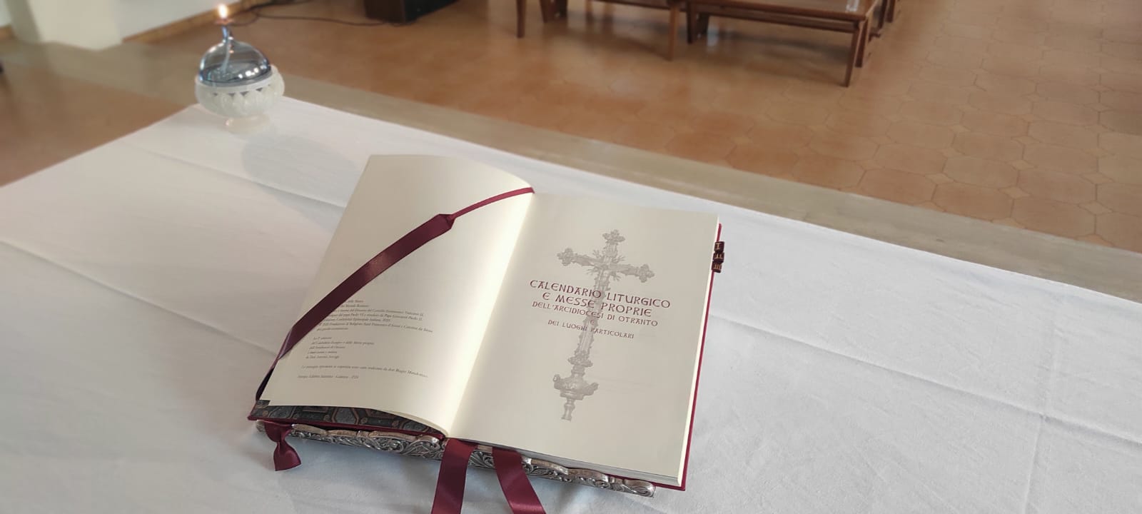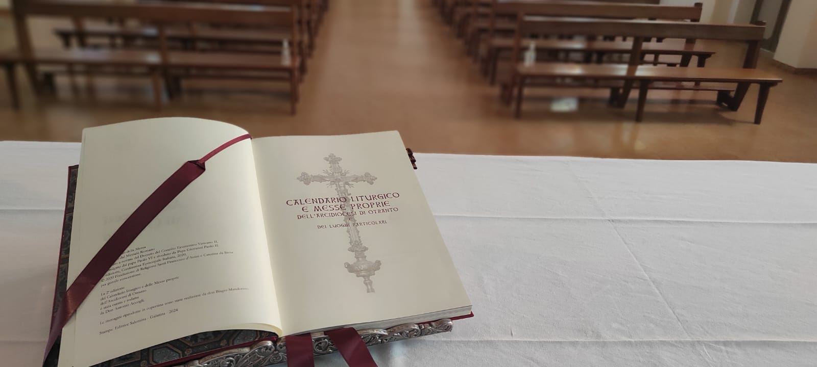 Il volume, stampato presso l’Editrice Salentina di Galatina, è stato curato da don Antonio Accogli, Direttore dell’Ufficio Liturgico Diocesano. I bozzetti per la stampa in oro della copertina sono stati preparati da don Biagio Mandorino, che ha attinto dal patrimonio artistico della Cattedrale e dalla simbologia tradizionale elementi che esprimessero il Mistero che si celebra nell’Eucaristia. In copertina è raffigurato l’Agnello Pasquale trafitto ma vivo. Sotto di lui i Santi, “quelli che vengono dalla grande tribolazione, che hanno lavato le loro vesti, rendendole candide nel Sangue dell’Agnello” con chiara allusione ai santi Martiri idruntini. Il disegno si ispira infatti a due dei capitelli delle colonne scolpite da Gabriele Riccardi e che facevano parte dell’antico ciborio del “Cappellone” dei Martiri idruntini.