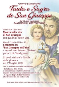 Il “Gruppo Tavola di san Giuseppe” della Parrocchia san Luca Evangelista di Palmariggi, organizza dal 13 al 20 luglio p.v. la “Taula e Sagra de San Giuseppe” presso il Santuario di Montevergine.