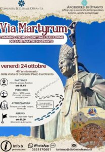 𝑉𝑖𝑎 𝑀𝑎𝑟𝑡𝑦𝑟𝑢𝑚 è la proposta di un pellegrinaggio storico-spirituale sulle orme dei Santi Martiri Idruntini, che si terrà a Otranto nel pomeriggio di venerdì 24 ottobre p.v., in occasione del 45° anniversario della visita di San Giovanni Paolo II alla nostra Arcidiocesi.